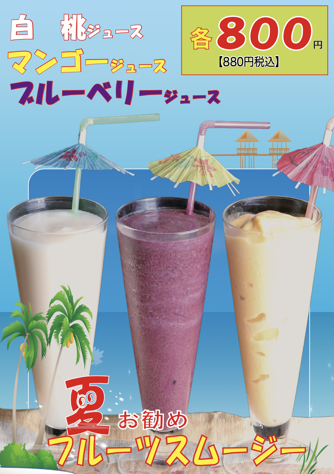 ■◇■ 夏季限定メニュー ■◇■  濃厚なフルーツスムージー=白桃=マンゴー=ブルーベリー=お食事後のお口直しにもおすすめです
