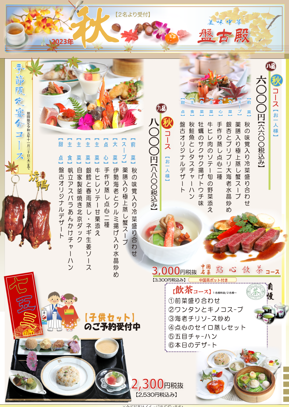 ■◇■ 秋季限定コースのご紹介 ■◇■ 秋の味覚!牡蠣や銀鱈など・・・接待はもちろん、七五三のお祝いにもお勧めです!2023年10月1日(日)〜11月30日(木)まで